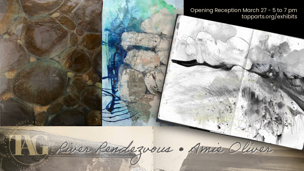 “River Rendezvous” begins and ends with water from the Tappahannock, the James, the Potomac, and other coastal terrains- mixed with permanent ink, acrylic paint, liquid graphite and occasional sand, crystals and regional remains. Her paintings and work on paper explore shifting coastlines and transitions between regions, climates and seasons. Each painting or drawing explores the essence of its origin and its endless journey.