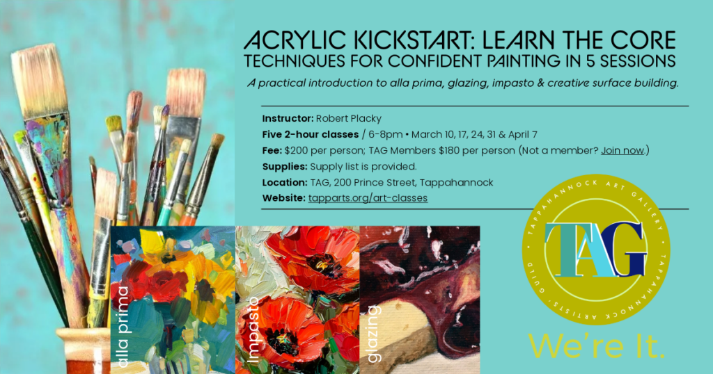 The class will start with a review of the supplies, basic handling of the material, brush control, and working wet-into-wet (Alla Prima). There will be a discussion on how acrylics behave vs. other paints, different brush types & brush marks/strokes. There will be a demonstration with color mixing using a limited palette and completing an Alla Prima study of a white still life. Each session will end with a class share/critique, questions & clean-up and a preview of the next session.