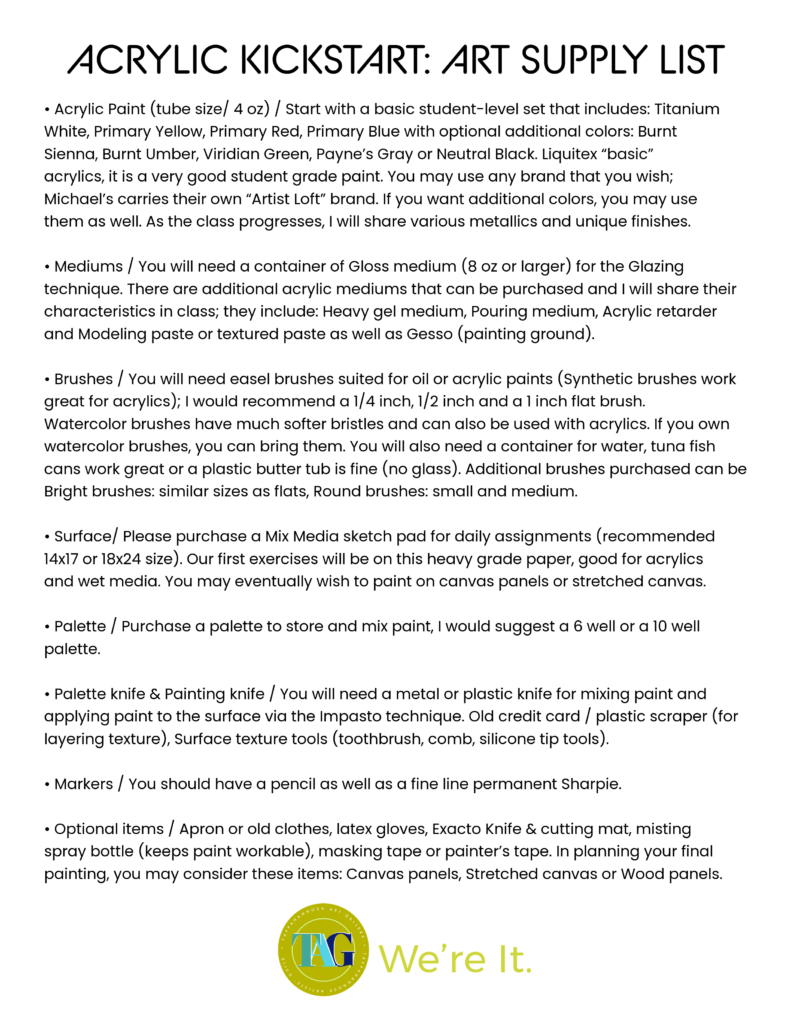 * TAG invites all people to participate in classes, and we never want price to be a barrier. If you can’t afford to attend a class, send an email to info@tapparts.org or call 804-925-1011. We have scholarship funding available for high school students, seniors on a fixed income, or people in a tough spot financially. No shame!