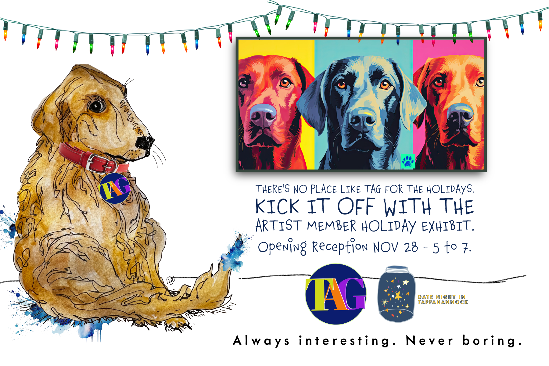 11/28/25 • TAG Artist Members Holiday Exhibit 11/28/25 • TAG Artist Members Holiday Exhibit RECIPE FOR FUN INGREDIENTS A whole herd of creatives Art supplies Imagination Holiday adrenalin An adoring public Wine Snackies INSTRUCTIONS Combine all ingredients Stir vigorously Spread evenly around art gallery Bake until golden IT ALL STARTS At DATE NIGHT IN...